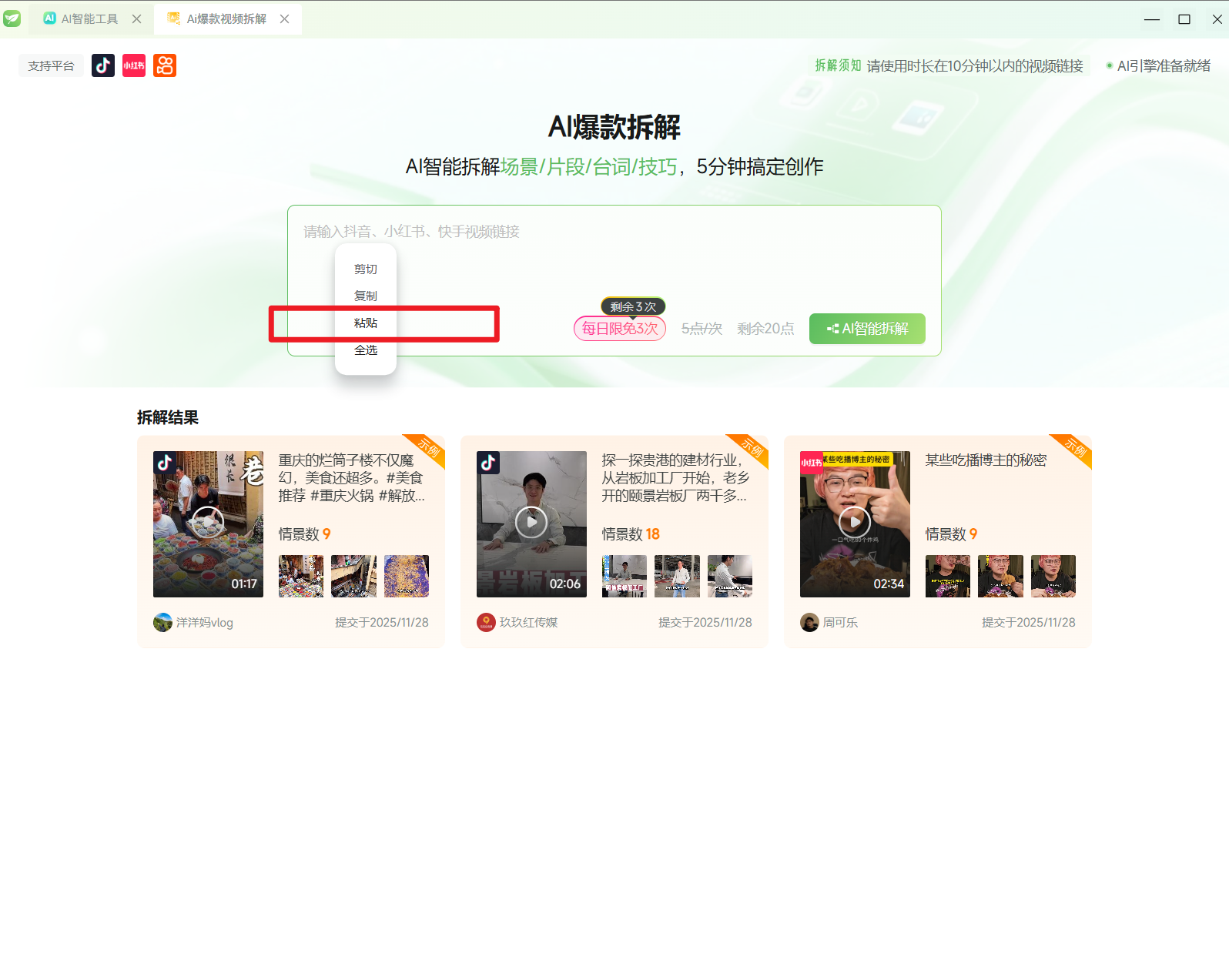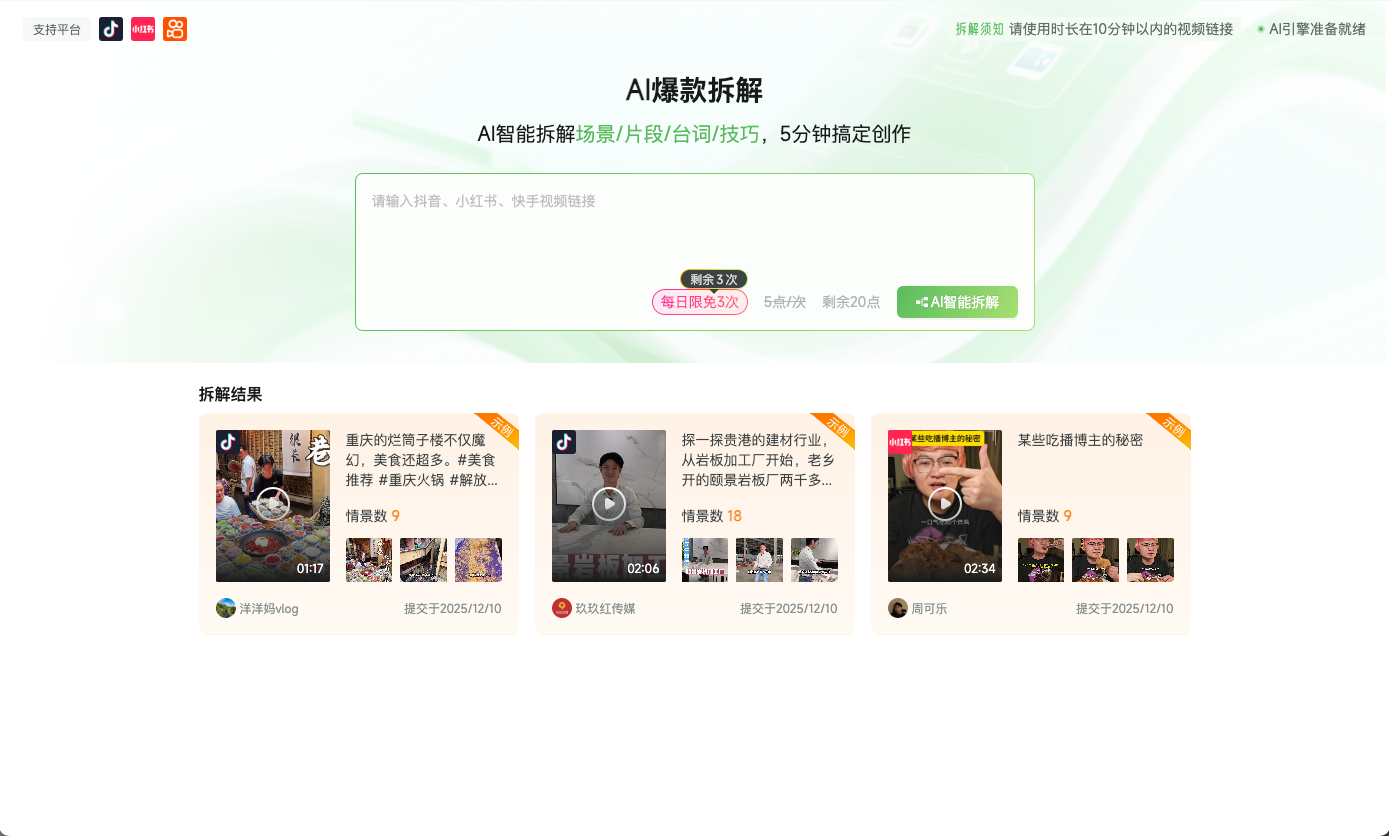 输入短视频地址,Ai智能分析数据并拆解脚本内容,支持导出脚本立即体验