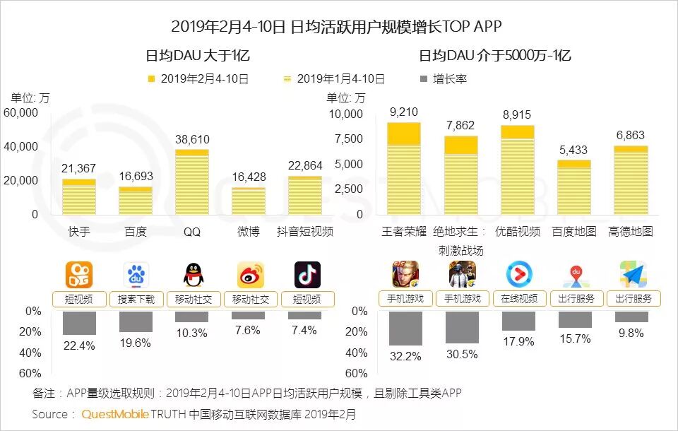 新榜讯 2月26日,QuestMobile发布《2019春节大报告》。数据显示,2月4日到10日,用户增长主要分布在泛娱乐和社交领域,从DAU上看,用户过亿阵营里,增速前五的分别是快手22.4%、百度19.6%、QQ10.3%、微博7.6%、抖音短视频7.4%,这么一来,快手DAU达到2.14亿,比抖音短视频的2.29亿相差无几了。在5000万到1亿用户阵营里,王者荣耀、绝地求生:刺激战场等游戏可谓霸主地位不可撼动。