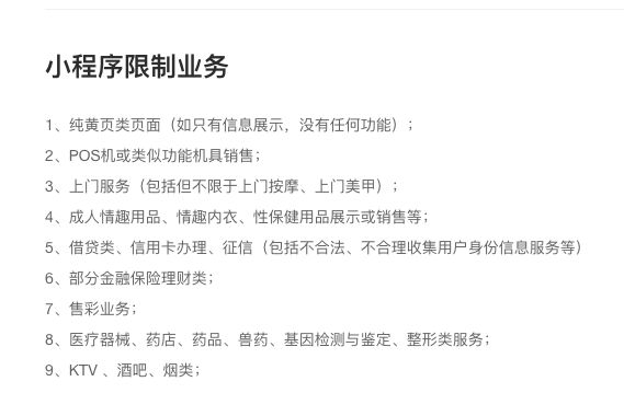 这里需要注意的的是,支付宝小程序也会有一些限制业务,简单的信息展示和借贷类、信用卡服务等都是不能碰的。