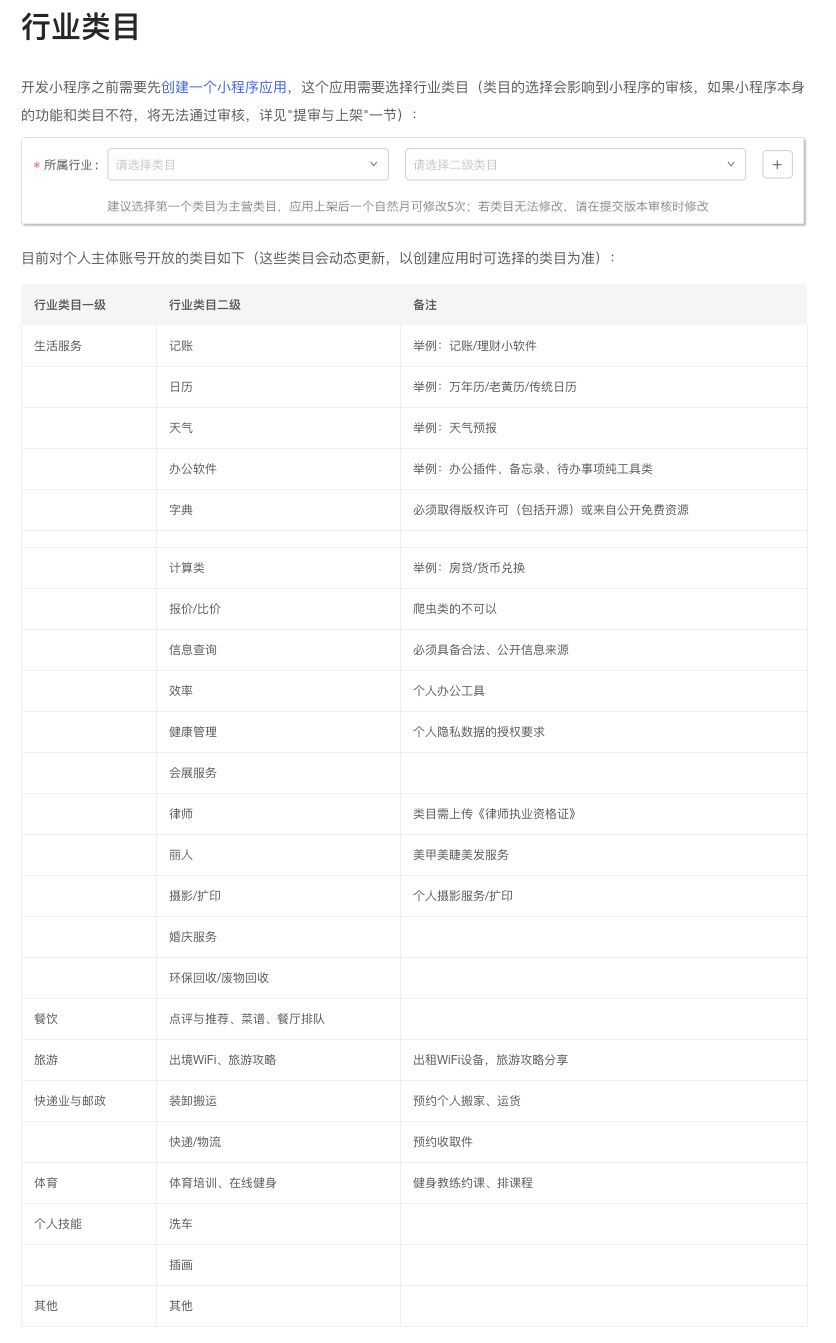 除此之外,在创建小程序时可以看到,个人开发者类目要比企业少一些,分为生活服务、餐饮、旅游、快递业与邮政、体育、个人技能、其他六大类目,其中最大的生活服务类目包括记账、日历、天气等26个二级类目,从这一点似乎也能看出平台希望个人开发者能在生活服务上有所侧重。