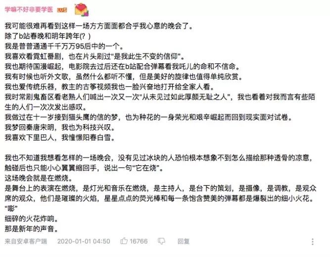 跨了个年回来,身边很多人都在补一门叫“B站晚会”的课。 还有同行发朋友圈隆重安利:建议所有新媒体人都去看看! 一开始我是不解的,跨年晚会而已有什么好补的,结果昨晚刷到凌晨1点无法入睡,太上头了!捧着手机的我全程一边疯狂发弹幕诅咒阿伟,一边保持微笑跪得安详…… 直播同时在线观看8000万,全程回顾视频3575万播放,84.5万弹幕几乎都在“卧槽牛逼”与“崩溃泪目”中反复切换。 B站晚会怎么就被夸疯了? 本着认真钻研的态度,补完了课的我又围观了晚会视频的弹幕与网友评论,下面正式带大家走近科学—— 作为国内首个试水跨年晚会的互联网公司,B站这次拿出了大排面,一场晚会,一炮而红。 虽然占了一点录播的便宜,但内容的饱和度和走心程度都让人无话可说。(没错,本文会有一种大型彩虹屁画风,但对不住,不吐不快了) 晚会主持,一位是国家认证段子手朱广权,同时又是B站鬼畜区大佬,出口就是段子,不知道一晚上又贡献了多少鬼畜视频素材。 另一位是湖北卫视《非正式会谈》的“书记官”陈超,这个节目是B站引进出品的,受众主要是大学生。两个人搭配既有梗可玩,又不失晚会的庄重。(虽然提词器太高,以至于所有人都不得不“翻白眼”) 晚会分为三个篇章:日落,月升,星繁,被网友称为“青春记忆大联播”,可以说雅俗共赏,全程高能。 所谓高能配置首先体现在乐队上。B站晚会的音乐总监赵兆是北京奥运会开幕式和闭幕式的音乐团队的核心成员,在场的还有靳海音弦乐团(《歌手》御用班底)、新九州爱乐乐团,可谓顶级配置。 交响乐与各类音乐融合贯穿整场晚会,节目内容从中日漫游、网络流行、古韵国风,到虚拟与现实的跨次元碰撞,可以说要啥有啥。 日落开篇是O-DOG舞团《魔兽世界》舞蹈秀,致敬陪伴玩家走过了15年的经典游戏魔兽世界,仿佛一场魔兽世界演唱会。 如果从跨年晚会的角度来看,这个开场简直可以用“莫名其妙”来形容! 但80后90后的游戏魂就这样被点燃了,弹幕纷纷飘过“兽人永不为奴”“为了部落,为了联盟,为了圣光的荣耀”“怀念一起下副本的朋友”…… 身着西装坐在格子间里的中年人,内心还住着重回少年的梦。那天夕阳下的奔跑,是各位一去不返的青春。 然而,当你还停留在魔兽世界,GAI的《哪吒之魔童降世》电影主题曲、新裤子乐队的《生活因你而狂热》、冯提莫的《佛系少女》就把你拉到2019大热的流行文化当中。 看到满屏的“吸吸吸吸吸吸吸吸吸吸吸”,不要方,这不是什么妖术现场,而是冯提莫在b站晚会上唱了《好运来》的歌,网友在吸收福气。 冯提莫最近刚签约B站,也是签约后首秀,虽然不是B站原生up主,但借此圈得不少路人粉,收获了网友的“可可爱爱,另眼相看”。 2019限定流行过后,一波疯狂回忆杀动漫组曲突击催泪(有内味儿了)。 从炮姐、数码宝贝、逮虾户到名侦探柯南,网友在这些主题曲联播中“时而起立,时而下跪”,说到底,谁解释得清为什么亚古兽进化这么好哭呢! 抛开回忆杀不说,哪怕只是被组曲中的钢琴演奏者V叔(维涅泰罗)瞪一眼,也能收获新年的快乐! 更好哭的还有第二三篇章中我为歌狂的青春回忆、权游的游戏主题曲以及《哈利波特》系列电影主题曲。 理查德.克莱德曼已不再年轻,但当王子变国王,坐在钢琴前,观众仍然一秒梦回霍格沃茨。所有的乐手都戴上了魔法帽(不方便戴的戴在了琴上,细节萌),舞台特效中飘浮的蜡烛随着音乐跌宕浮动,有多少人到老也会等他的猫头鹰。 回忆杀之余,网友的弹幕在军心爱乐合唱团的《种花组曲》纷纷变色,云飞兄张光北出来唱《中国军魂》的时候,弹幕纷纷刷过“二营长,我的意大利炮”“亮剑一出,瞬间泪目”…… 有网友表示:“游戏、动画动漫、电影、流量、古风、演奏……以及军歌太硬核了,我竟然热血沸腾甚至想高歌国歌!当时弹幕满满的爱国语录十分感人!” 第一篇章最后,B站请了拳头S9主题曲《涅槃》原唱Chrissy Constanza来现场,还出现了一些LPL战队在S8、S9的名场面。 音乐的部分,B站实际上兼顾了小众文化与大众潮流。 有B站音乐区头部up主的神仙聚会,有邓紫棋、周深、吴亦凡、五月天的歌手碰面(基本都是现场非常稳的歌手,邓紫棋和周深真是绝了,不愧是弹幕中“吃了CD”“被老天爷喂饭吃”的歌手);也有传统音乐的大型演绎。 当吴亦凡唱着大碗宽面的时候,弹幕却没一个吃字,而是各种“路转粉”“来了就是自己人”这样的滚动条,难以想象前几天b站的运营刚还为吴亦凡道过歉。 传统音乐的部分,尤其值得一提的是国乐大师方锦龙!!硬是把B站晚会变成了大型圈粉现场,先是跟虚拟偶像洛天依跨次元合奏《茉莉花》。 随后跟百人乐团合奏,曲目包括十面埋伏,沧海一声笑,将军令,火影,魂斗罗,教父……与百人乐团合奏的11多分钟,称得上整场晚会的高潮。 弹幕全程都在刷“武器大师开大”“人形乐器实锤”“浑身发麻”“奈何老娘没文化,一句卧槽走天下”…… 值得一提的还有B站请来了初代Disco女皇张蔷(注入灵魂了),既然是跨年,睡什么睡? 网友甚至发明了观看张蔷环节的正确姿势:画面比例调成4:3,清晰度调成360P,饱和度调满,然后手动镜像模式(试过,值得拥有,手动连击镜像太上头,完全打开了新世界的大门)。 一场晚会下来,据说哔哩哔哩股价上升了近两个百分点。 网友们一边疯狂夸赞,一边为B站“是否会燃烧经费到破产”