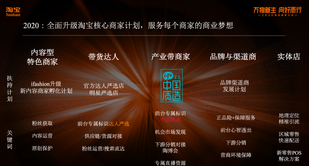 新榜讯 5月13日,淘宝公布2020年全面升级淘宝核心商家计划:2020年,官方将对内容型特色商家、带货达人、产业带商家、品牌与渠道商以及实体店(正在规划中)进行专项扶持。