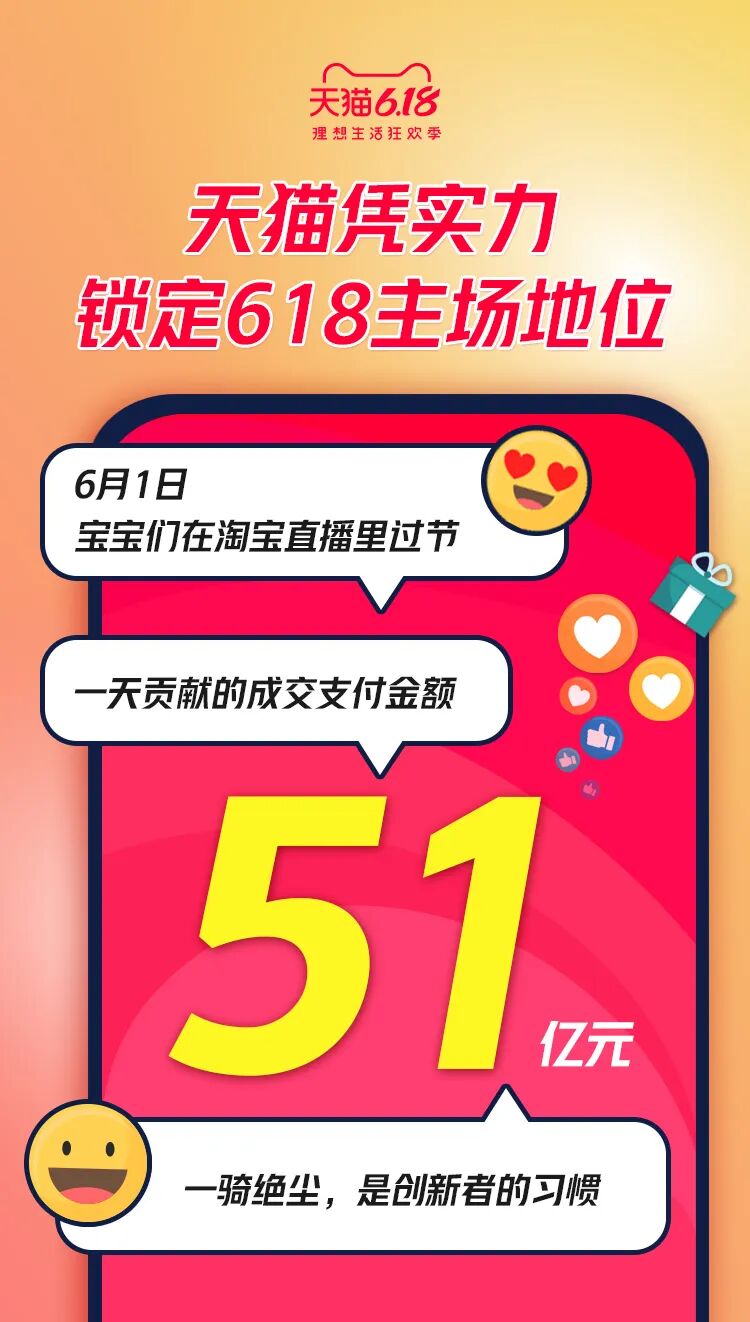新榜讯 6月1日,淘宝直播一天的成交支付金额超过51亿元。数据显示,全天20多个品牌、商家及主播的淘宝直播间成交超过1000万元。 据介绍,预售启动以来,天猫618已开140多万场淘宝直播,是其它平台在整个618期间全部计划场次的5倍。 天猫618发布的首日成交额数据显示,开售第1个小时,苹果、耐克、海尔、美的、阿迪达斯、华为等32个品牌的成交额相继突破1亿,国货品牌和国际品牌各占半数。 更多资讯,敬请关注公众号「新榜有货」(ID:newrankTV)。