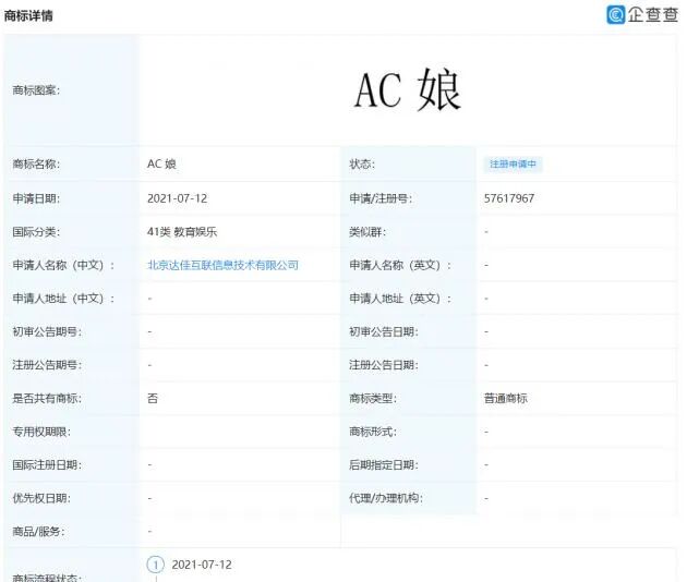 据天眼查App 近日,快手关联公司北京达佳互联信息技术有限公司申请注册“AC娘”商标,国际分类包括网站服务、教育娱乐,目前商标状态均为“商标申请中“。 据悉,AC娘是视频弹幕网站AcFun的拟人化萌娘,同时,也作为AcFun弹幕视频网的看板娘。 更多资讯,欢迎关注公众号“新榜”(ID:newrankcn)。