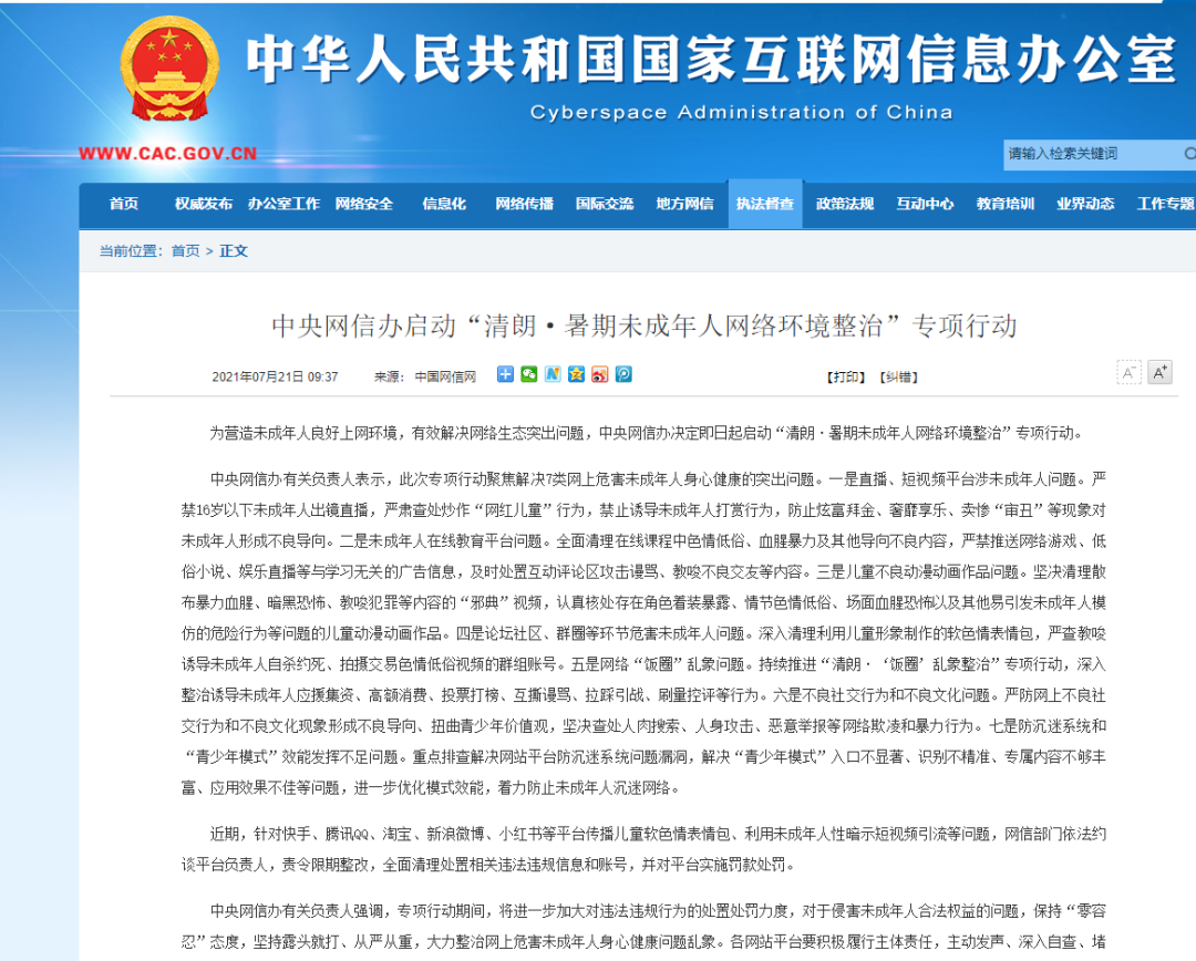 据新华社 即日起,中央网信办启动“清朗·暑期未成年人网络环境整治”专项行动,聚焦解决直播、短视频平台涉未成年人问题,严禁16岁以下未成年人出镜直播,严肃查处炒作“网红儿童”行为。