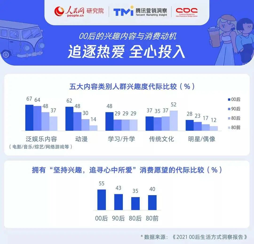 新榜讯 近日,人民网研究院携手腾讯营销洞察(TMI)、腾讯用户研究与体验设计部(CDC),发布《2021 00后生活方式洞察报告》。报告围绕00后的生活方式、选择偏好与消费行为展开研究。样本主体聚焦成年人群,小部分未成年群体信息来源于监护人。