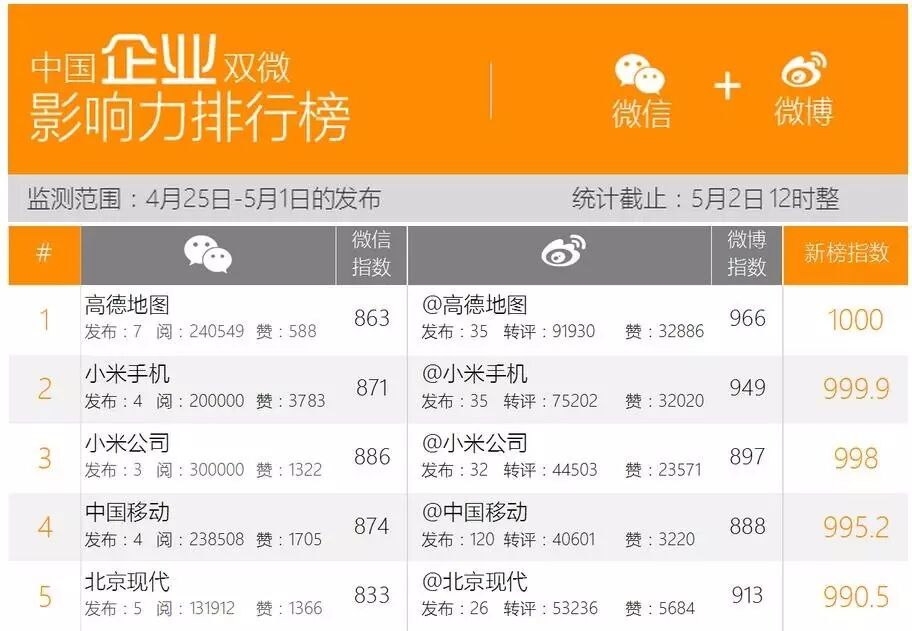 在新榜发布的中国企业双微影响力排行榜中,小米的表现可以用“稳定而突出”来形容。初略统计近2个多月的10期榜单数据,小米旗下“小米手机”、“小米公司”(任一个)有9期都在榜单前十,而另1期它们也在榜单前20。这也就不难解释,为什么它们发起的一个活动就能引起用户如此热情的参与。