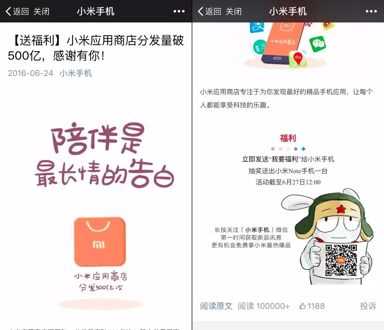 截止今天下午1点,24日@小米应用商店发布的活动相关的微博多达28条,其中最热门的一条是24日发布的插画长微博,转发量达到70109,评论量达到12383;微信服务号“小米手机”配合活动发布的微信图文阅读量早已过10万+,点赞量(含评论点赞,仅放出评论14条)达到22490。据肖壹透露,目前微博、微博、论坛等平台的总曝光量已破千万。
