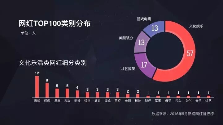 从物以类聚到人以群分的时代,80后这一代人之前,看待一个事物,比如说淘宝,可能是用某一个品类划分,今天我们生活在一个个圈层里,我们做出网红TOP100榜的分布,我们可以看到,游戏电竞、美颜装扮、小文化娱乐都很多。