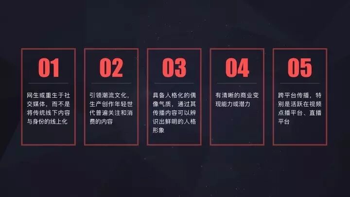 新榜是怎么看待网红这个现象的?现在讲网红通常是锥子脸、大长腿,我觉得今天我们谈网红肯定不是锥子脸,我认为锥子脸也不会是网红的主流。在新榜的定义中什么是网红呢?我们给出了这几个标准,其中我们觉得最核心的是来自于个人的,人格化的品质。也就是我们讲的具有人格化的偶像气质,通过他传播的内容,可以辨识出鲜明的人格形象。