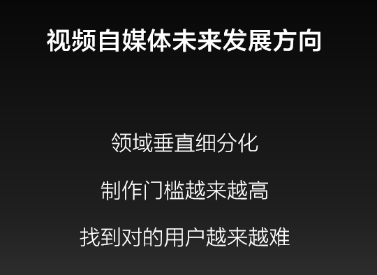接下来要说的是视频自媒体未来的发展方向,领域垂直细分化,当然制作门槛也会越来越高,还有找到对的用户可能越来越难。前段时间,头条号和新榜一起举办的新媒体公开课,很多做自媒体的加我,跟我反馈特别特别多的问题,说你是怎么一点一点做起来。他们跟我说,现在特别难。大家可能一味地都在往搞笑、往娱乐这方面去进攻的时候,可能忽略了很多很多自己擅长的东西。