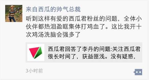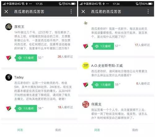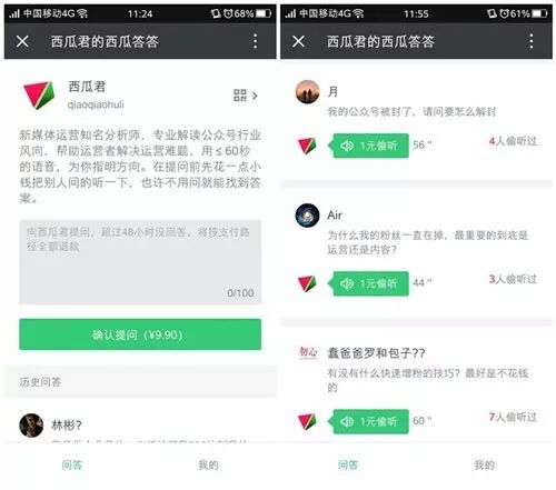 西瓜答答为运营者和用户之间的互动搭建了更好玩、轻松、简单的平台,根据公众号定位和运营者擅长的领域,鼓励用户付费提问,“用户提问——运营者回答”,这一过程可以被全程围观、分享,互动形式更加活泼,让公众号的轻度用户轻松过渡到重度用户。