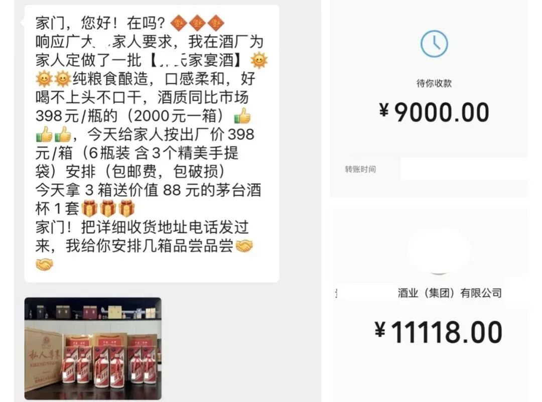 当我问酒水是否来自正规厂家,对方表示“必须是,贵州茅台镇XX酒业,在百度也可以搜到”。但由于我没有按对方的要求买酒,对方也表现出警惕,不再透露更多内容。