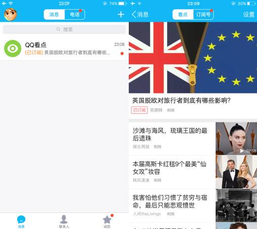 近日,在手机QQ6.5版本最新一次测试中,不少媒体发现QQ对“QQ看点”的展示规则进行了调整,运营者发布的文章除了在“订阅号”标签页中展示之外,用户主动订阅的内容也会出现在粉丝的“看点”中,并且会标上“已订阅”的标签。QQ公众号试图通过这种方式实现对运营者账号和内容的双曝光。