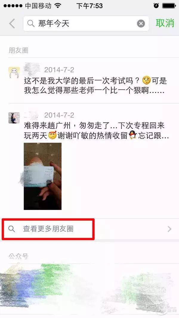 点击微信顶部搜索栏——输入“那年今天”后点击搜索——在检索出的内容中点击“查看更多朋友圈”即可查看所有“那年今天”朋友圈内容,连已经删除的内容也能被搜索出来。不过,昨天晚些时候,微信将这一功能下线了。