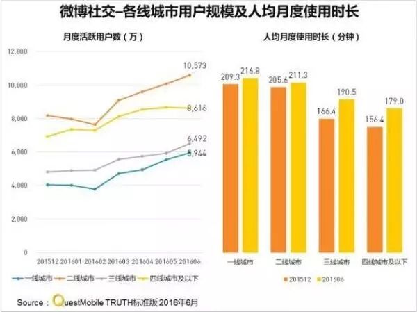 新榜综合报道 专注于移动互联网研究的数据服务公司QuestMobile今日发布年中盘点报告指出,进入2016年微博社交在一线城市、二线城市、三线城市增长势头不减,一线城市涨幅接近50%,二线城市已经领跑,人均月度使用时长上,三四线城市的增长显著。