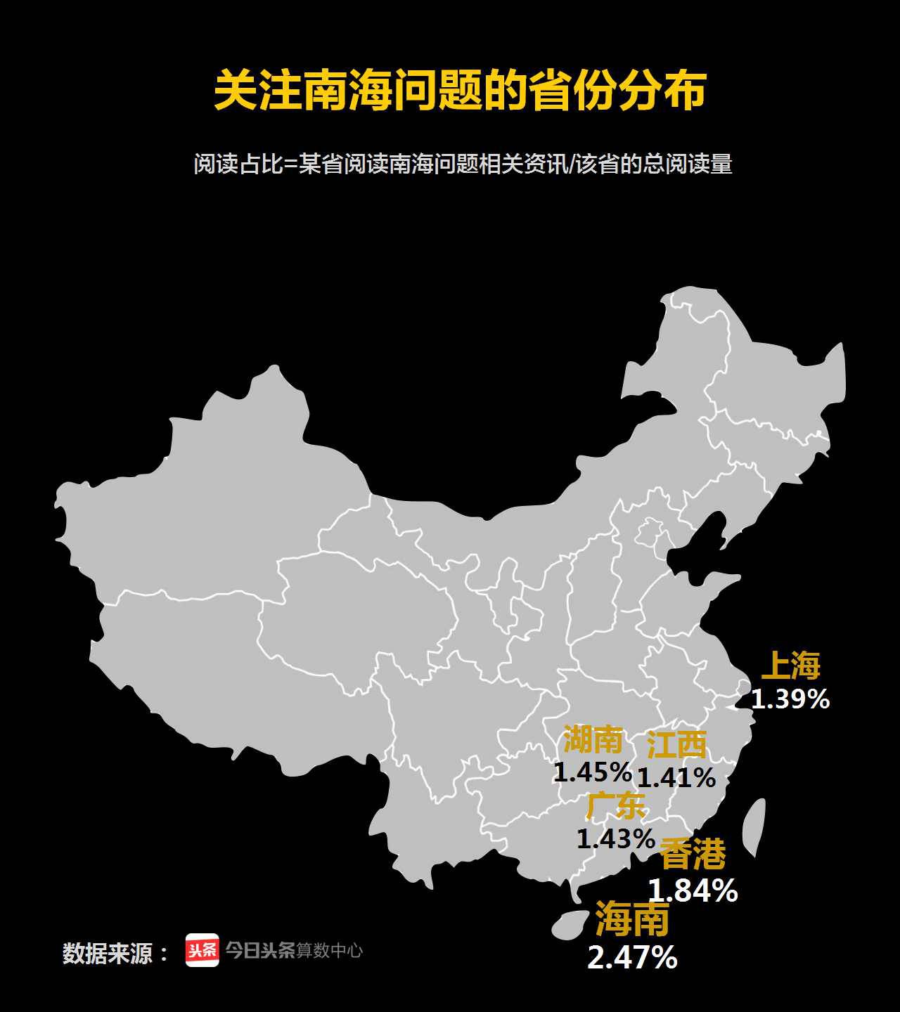 今日头条的用户对南海相关话题的感兴趣程度同样很高。观察今日头条媒体实验室监测5.3亿累计激活用户的阅读行为,南海问题热度在近三月持续发酵,于7月12日达到短期顶峰。自6月以来,南海相关话题13次出现在最热关键词“Top 10”的榜单上,其中4次位居第一。昨日,“Top 10”最热关键词全部与南海问题相关,最热的“仲裁案”话题热议值高达1亿,海南、香港、上海三个省份对南海相关话题最为关注。