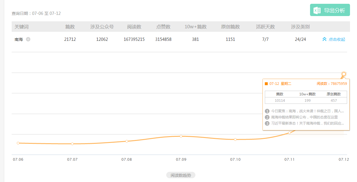 南海话题在微信端的传播趋势大体与微博、今日头条保持一致,12日热议趋势突然上升,共有10114篇当日发布文章讨论相关话题,截止12日24时,共获得阅读量7867.6万,其中10万+文章数达到199篇,原创文章数457篇。仲裁结果公布后,在未被删除的文章中,第一篇关于仲裁结果的文章在17:08发出,速度之迅捷,超出想象。(安利新榜刚推出的数据查询工具,网址http://data.newrank.cn)