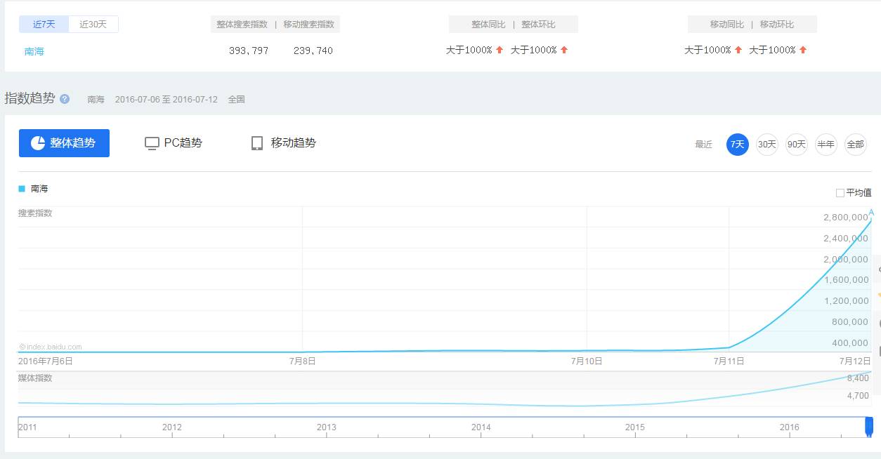 从百度指数来看,7月4日之前,“南海”等关键词的提及趋势基本稳定,在4000左右;4日-11日期间,“南海”等关键词的媒体指数有一定幅度的攀升,到11日已经达到10.95万;12日仲裁结果公布后,彻底引爆了媒体讨论,百度指数达到253.73万,是11日25倍。