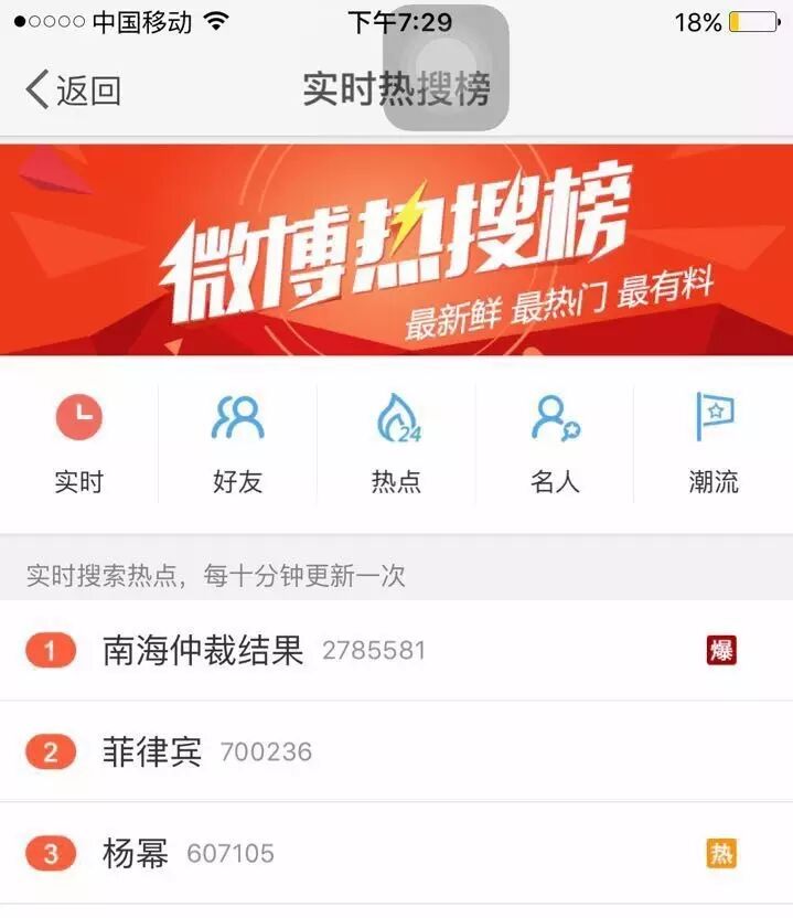 昨日仲裁结果公布后的2个多小时,微博上的热议表现绝对堪称惊艳:话题#南海仲裁结果#一直盘踞在微博实时热搜榜上,话题最热时,末尾甚至出现了红色的“爆”字,另外,#菲律宾#等南海相关话题也陆续出现在热搜榜单前列。