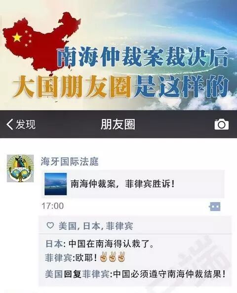《人民日报》在昨日晚间,在微博和公众号上发布了长图“南海仲裁案裁决后,大国朋友圈是这样的”,长图设想了各个国家都有微信账号,图中以生动幽默的方式描绘了各个国家在南海裁决后在朋友圈如何互动。长图发布后,“大国朋友圈是这样的”这个词汇也火了,两日,近百个自媒体公众号都在微信图文中使用了《人民日报》创作的图片和文字。