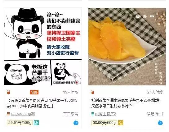 淘宝上出售“菲律宾籍”芒果干的店铺共27家,包括天猫超市、天猫旗舰店等销售大户。部分大户销量似乎未受影响,也未采取相应的措施应对热心网友。部分小店反应格外有意思,主要分为3种,1. 迅速表明立场型:我是国货,部分小店已经打出了“中国人自己的芒果干”等醒目标语;2. 抵制菲律宾型:本宝贝不发货了,欢迎监督;3. 理性爱国型:减价销售。