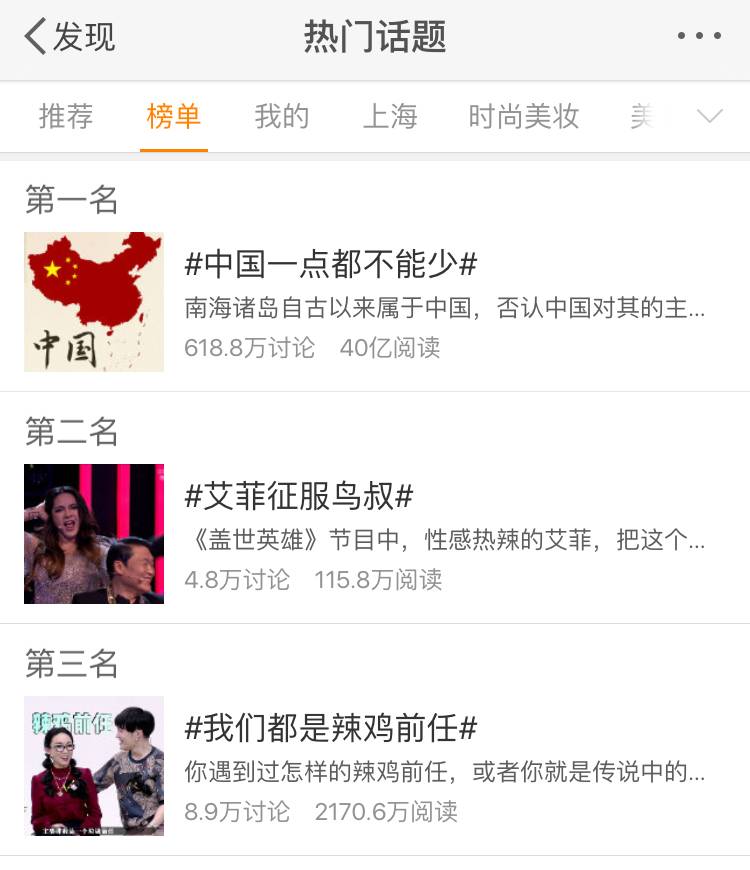 截止13日15点,在微博上搜索“南海”,可搜出相关话题125个左右,4个话题阅读量过亿,11个话题阅读量过千万,而阅读量过百万的话题很多。而关于南海事件的最热话题,显然是由@人民日报主持的话题#中国一点不能少#,截止13日19:00仍旧是热门话题榜单的第一名,获得40亿的阅读,618.8万讨论,与第二名拉开很远的差距。