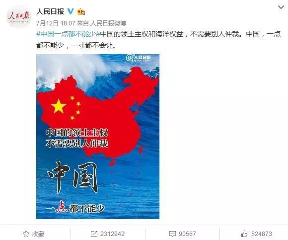 “一点也不能少”的出处是大家都很熟悉的《人民日报》。对于南海事件,《人民日报》新媒体的表现绝对算得上可圈可点,以最快的速度回应并表明立场,制造多个热点话题热以及传播度很高的图文,“一点也不能少”便是其中之一。11日早8点,《人民日报》就在微博上发起#中国一点不能少#的话题,配图是完整的中国地图,提前表明对南海裁决的态度。