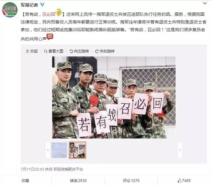 “若有战,召必回”使用频率同样很高,12日有389篇图文引用该词,10万+图文12篇,13日(截止17:00)有73条图文引用该词。这个词汇突然爆火,并非毫无因由,微博上@军报记者在11日晚配图回应,近来网上流传的海军退役士兵被召返部队执行任务的书函,其中提及士兵的心声便是“若有战,召必回”。而12日,南海裁决公布,部分公号便巧用这句话来表达态度。