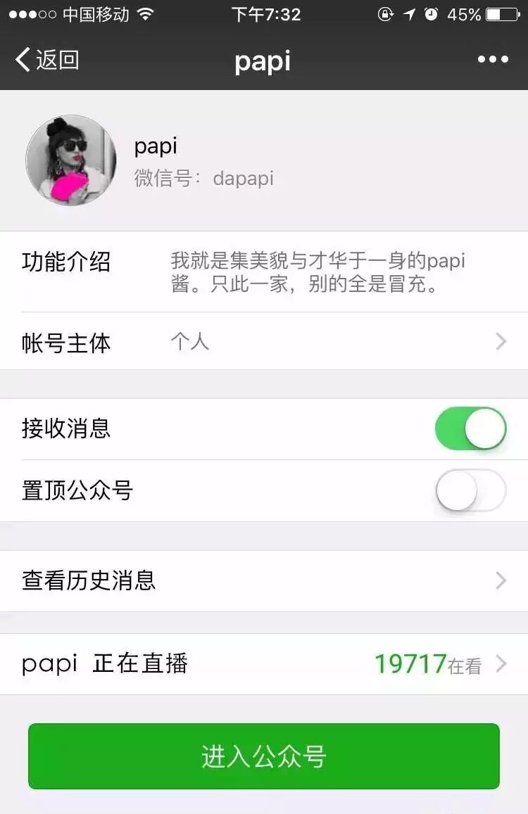 新榜讯 昨晚,一张papi酱通过公众号直播的截图在朋友圈流传,截图显示,“papi”公众号详情页,在历史消息下端显示“papi 正在直播,19717在看”。但具体的直播详情页面并没有。