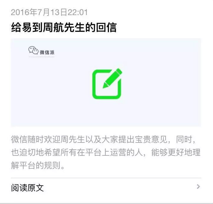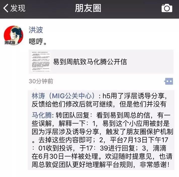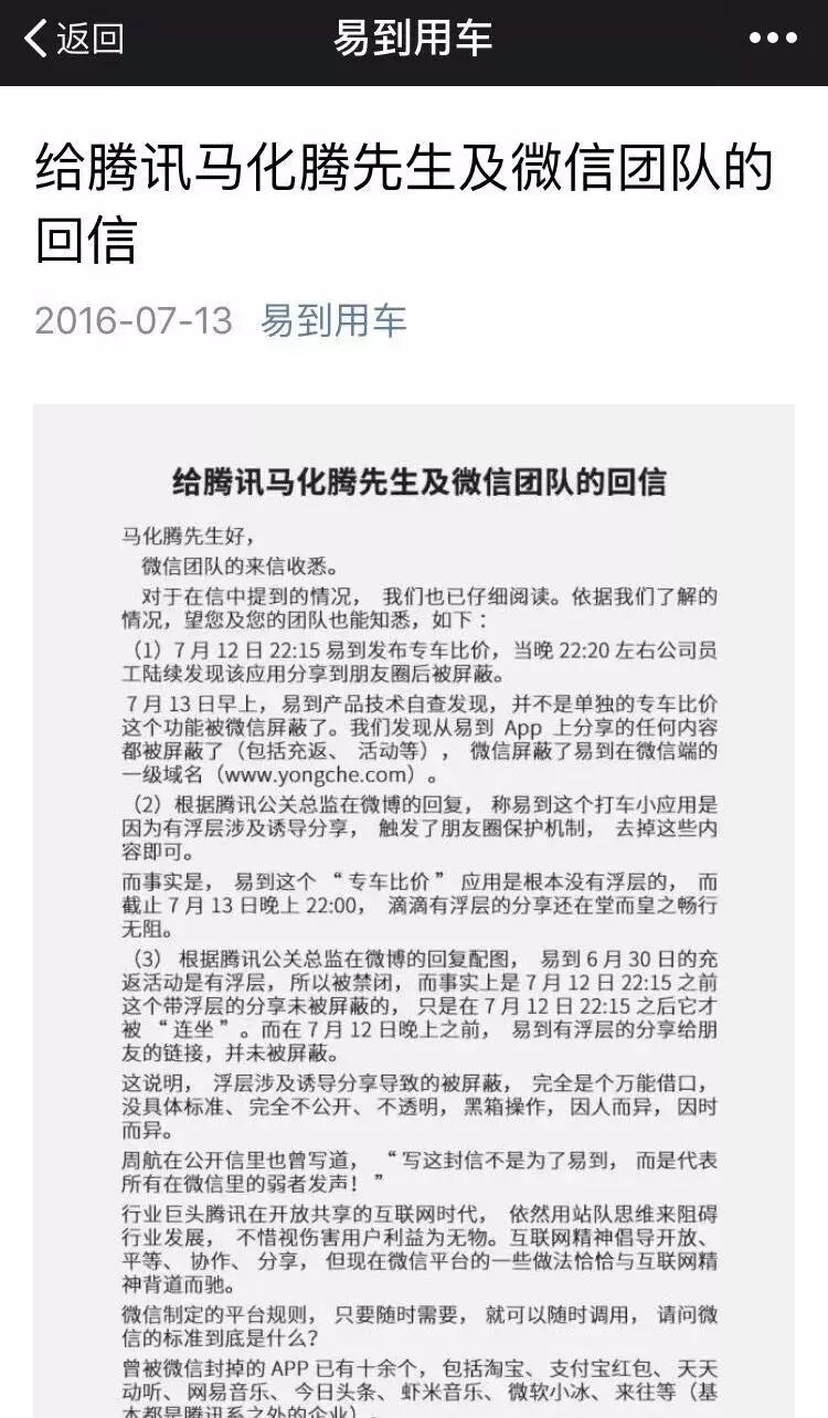 22点01分,微信官方账号“微信派”发布了《给易道周航先生的回信》,对周航提出的指责做出了详细回应。微信表示,易到的这个应用之所以被屏蔽,是因为使用了浮层,并存在诱导分享的问题,并且保证,对于其他主体的违规行为,平台也一定会一视同仁。比如滴滴,在6月30日同样因违规而被封禁。