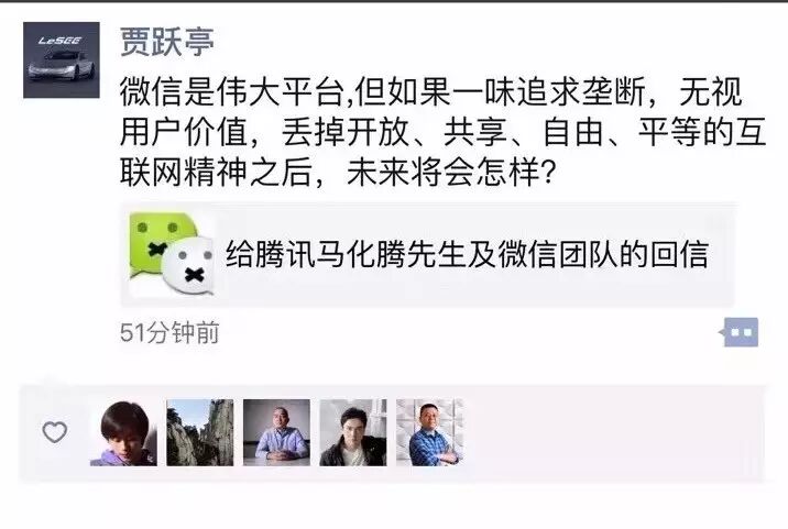 今天上午,易到的资本方,乐视的CEO贾跃亭也在微博和微信声援易到和周航,暗指微信“一味追求垄断,无视用户价值”。