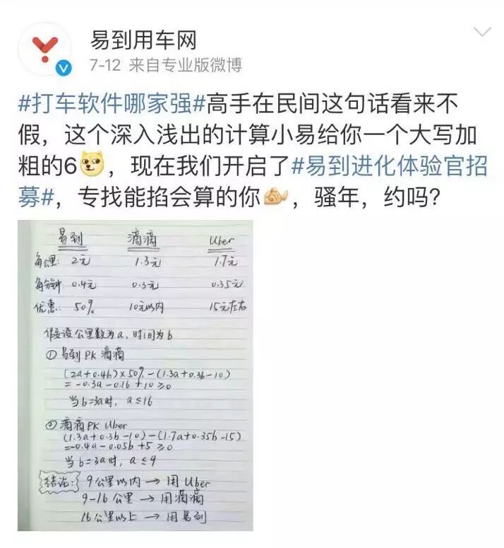 本周,一张专车比价的数学应用图在社交媒体刷屏,将易到、滴滴和Uber放在一起比较,并且易到放在了最前面,不少人认为,易到在这一轮刷屏中占了大便宜。就连易到自己,也在官微上发布了这张图片,进行了一次借势营销活动。