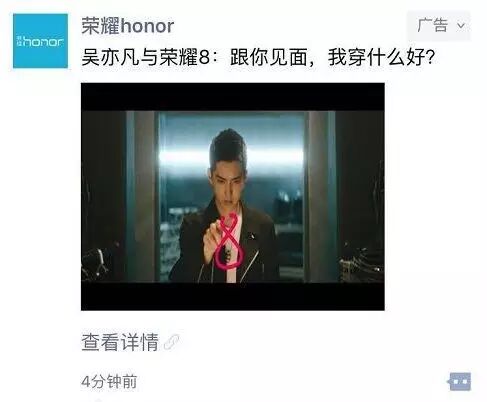 今天,华为荣耀为其新品荣耀8在微信朋友圈投放了广告,并附上了吴亦凡出演的最新TVC广告。