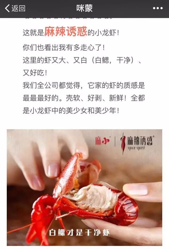 昨晚,“咪蒙”发布头条文章《识!食!物!者!为!俊!杰!》,文末出现大量小龙虾配图,显示是一篇“麻辣诱惑”小龙虾的软文广告。据悉,“咪蒙”的头条软文报价已经高达45万。
