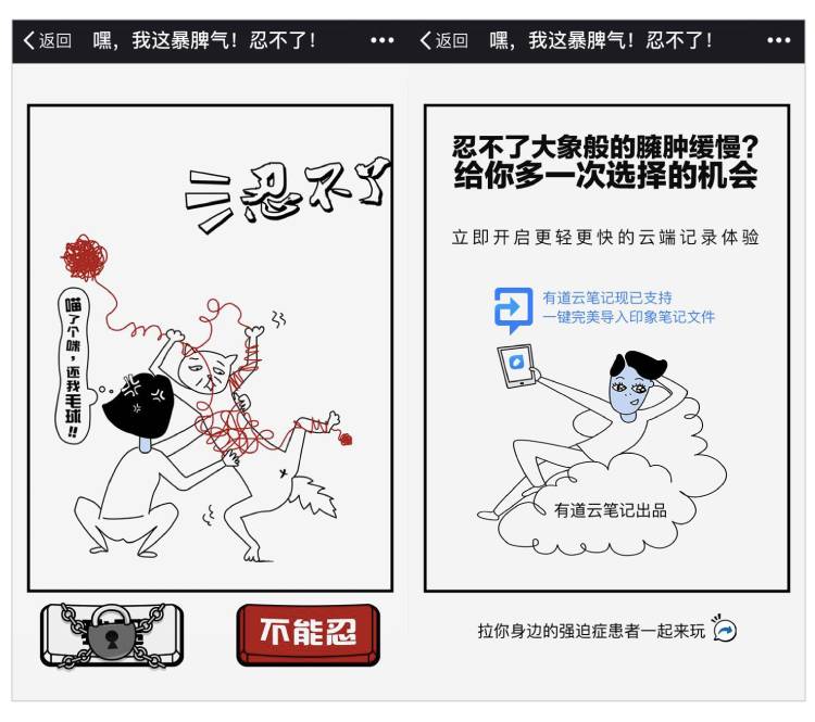 有道云笔记近日又做了一款魔性的H5,运用的是漫画形式,将强迫症患者最不能忍的几种情况用漫画展现出来,交互形式上也有向上滑动、点击、转圈等多种形式,最后引出有道云笔记最新的一键导入印象笔记文件功能。