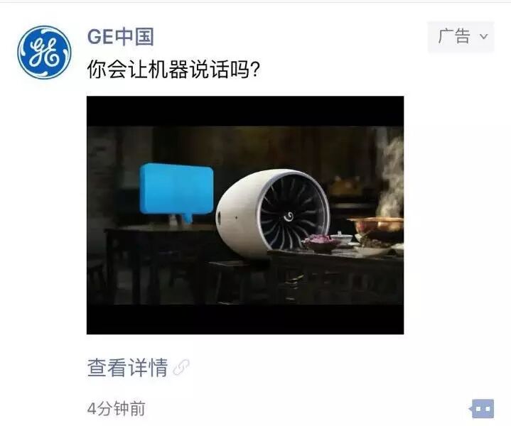今天,“GE中国”在微信朋友圈投放了广告,视频是一则科技男撩妹失败的广告,“GE中国”的愿景是,让机器会说话。