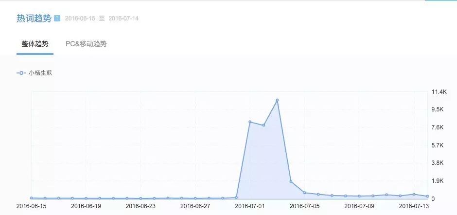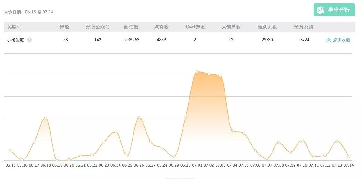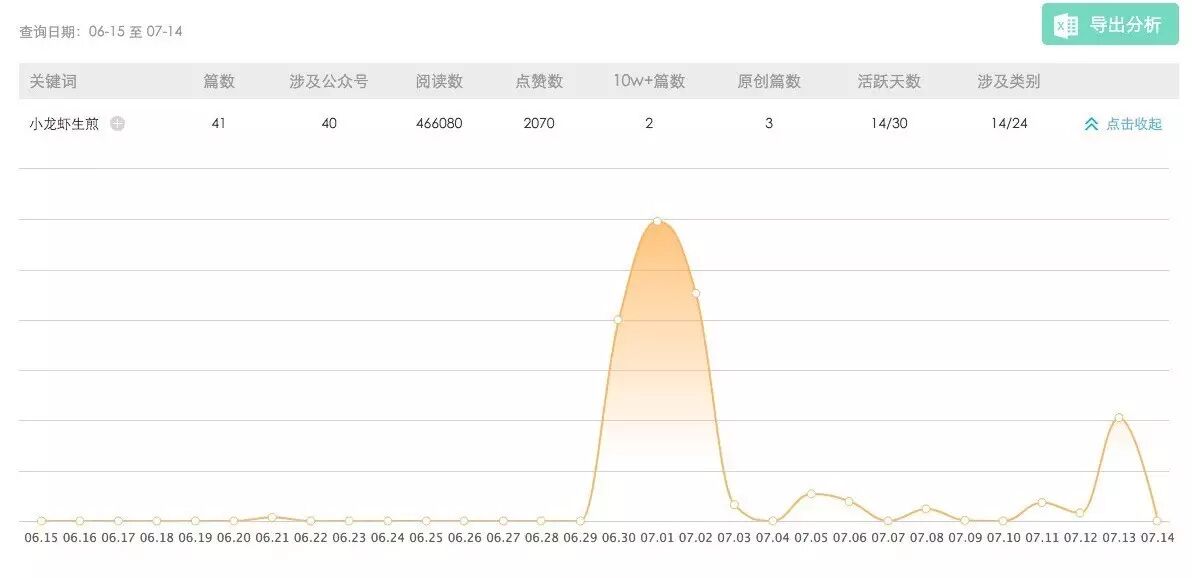 根据新榜后台的趋势搜索功能显示,带有“小杨生煎”和“小龙虾生煎”关键词的文章在7月1日都达到了顶峰,正是这些本地大号开始进行推广的时间。