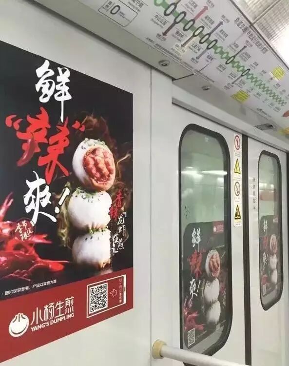 除了在微信和微博上的造势,小杨生煎在线下也进行了大手笔的广告投放,在上海地铁1号线、2号线等四条地铁线路站台和车厢内,都可以看见龙虾生煎的大海报。