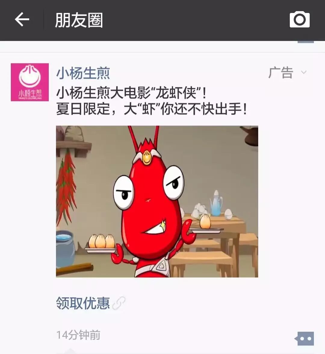 这几天,小杨生煎同时开始了朋友圈广告的投放,投放的是一则视频广告,并取名为小杨生煎大电影“龙虾侠”。