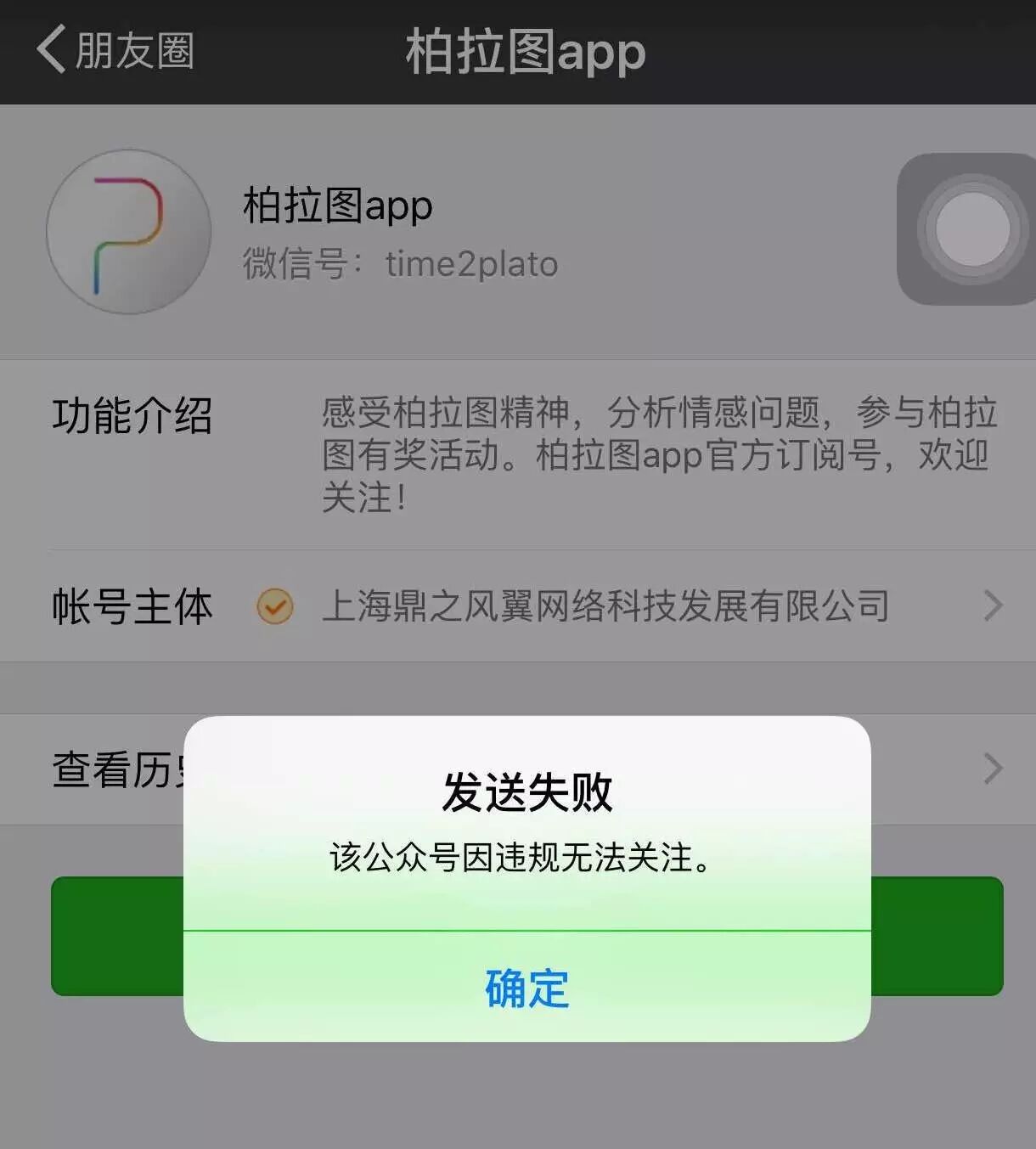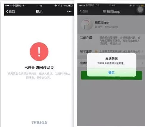 经过一上午的疯狂刷屏,中午12点左右,有用户发现“柏拉图”已被微信封号,而制作测试图的链接,也同样因诱导分享被封。