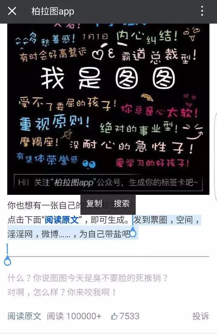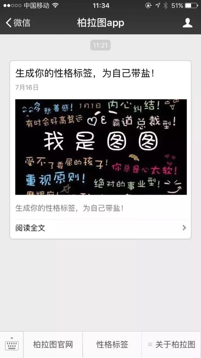 关注该公众号后,会收到一条关于制作这张性格测试图的介绍,阅读原文处添加了相关制作链接。这篇文章早已达到10w+。