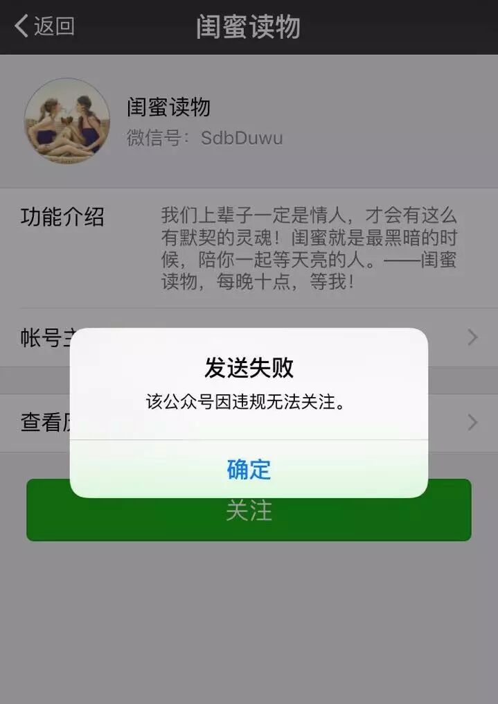“闺蜜读物”“文艺馆”等公众号,均利用同样的测试图试图吸粉,但都在下午被微信陆续封杀。