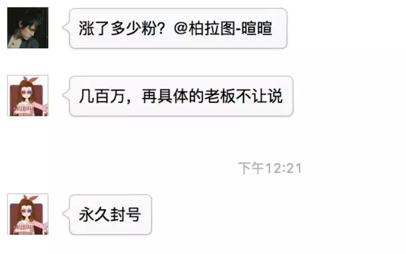 据悉,这次活动虽为“柏拉图”带来百万级的涨粉,但也因此被微信处以永久封号的极刑。
