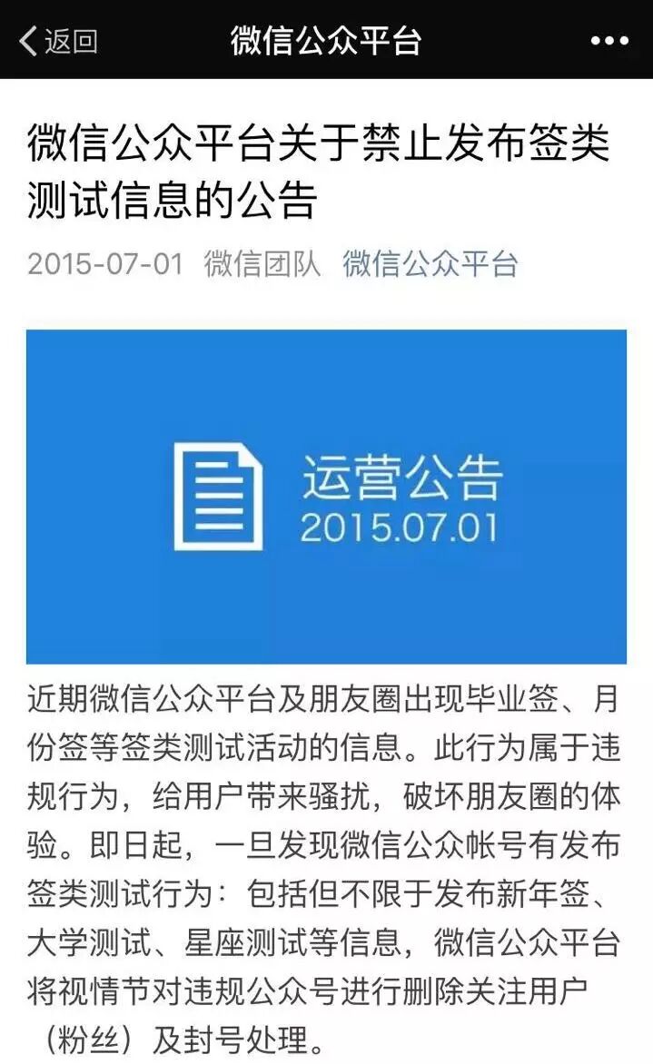 根据微信去年7月1日所发布公告,公众号禁止发布签类测试信息,包括但不限于发布新年签、大学测试、星座测试等信息,一旦发现,微信公众平台将视情节对违规公众号进行删除关注用户(粉丝)及封号处理。