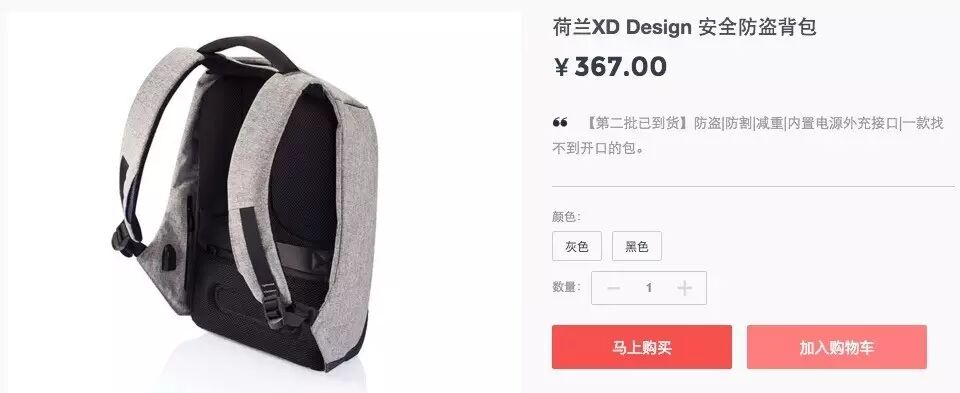 7月13日,“玩物志”通过微信公众号推荐了一款荷兰XD Design安全防盗背包,这款号称急死小偷和扒手的防盗背包,在玩物志平台上的标价为367元。让人没想到的是,这款背包的销量在24小时内很快突破了1000只,凭借这一款单品,就贡献销售额超过40万元。