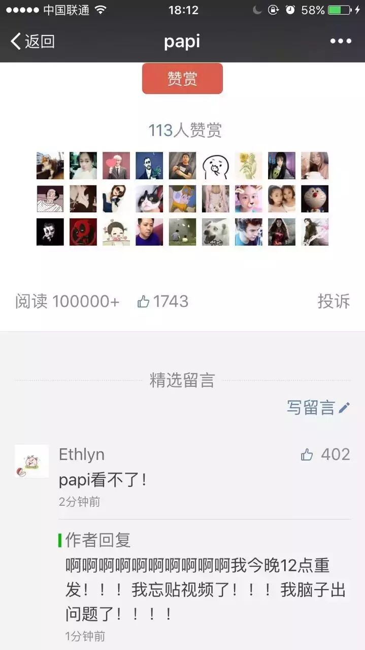 即便如此,该文章还是在10分钟内获得10万+,100多人赞赏。papi酱本人在评论区回复称“今晚12点重发”,原因是“脑子出问题了“。