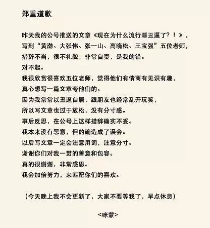 今天下午2点半左右,“咪蒙”公众号中再次推送了一则致歉声明,表示因为自己常常以丑逼自居,所以写文章也过于放松,没有分寸感。并表示今天不会推送新的文章。