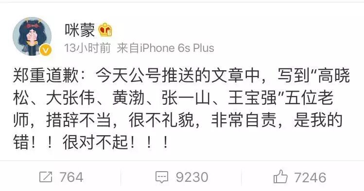 今天凌晨,咪蒙在微博发文称“郑重道歉:今天公号推送的文章中,写到“高晓松、大张伟、黄渤、张一山、王宝强”五位老师,措辞不当,很不礼貌,非常自责,是我的错!!很对不起!!!”