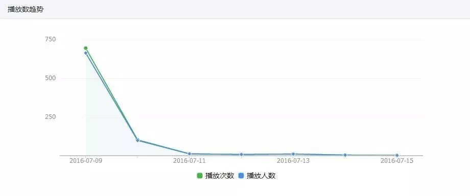 播放数趋势主要记录了微信图文发布后7天内的视频播放数据的变化,最常见的图表显示情况应该是递减的弧线,在特殊情况下,也会有不同的波动。
